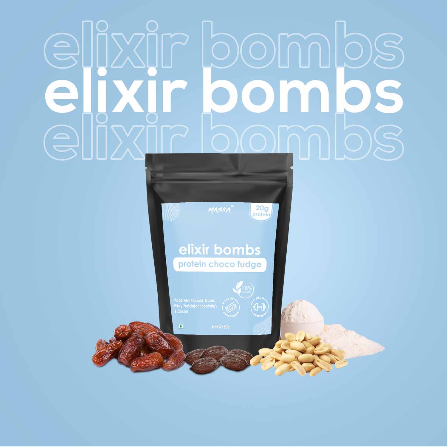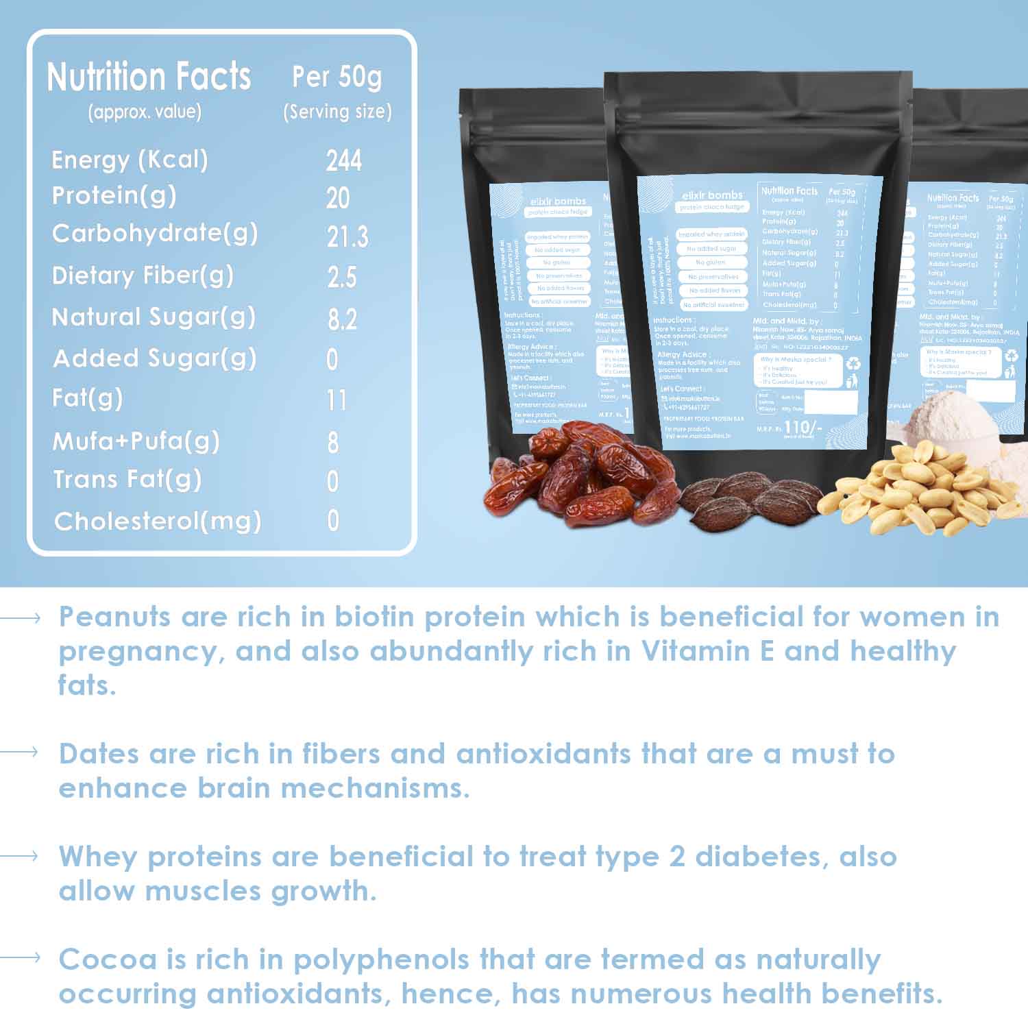 Here, at maskabutters we use a few ingredients that are dates, peanuts, whey proteins, and cocoa. These are rich sources of proteins and are good fats. These bars consist of wholesome goodness. You can munch it at any time especially to curb your 4 PM humger.